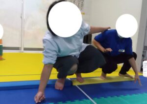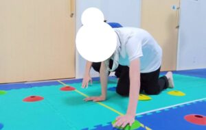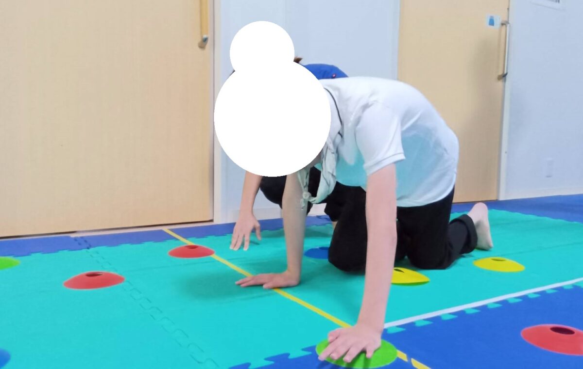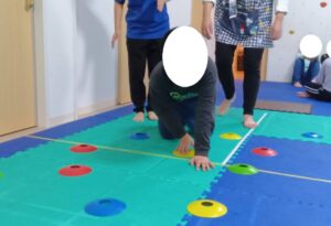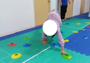 指定された色のカップをクマさん歩きでタッチしていきます。