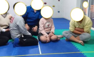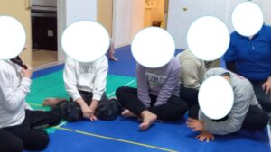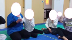 円になって座って、隣の人に「○○さん、こんにちは」といって