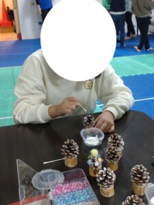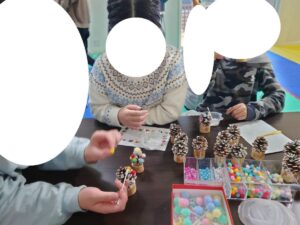 まつぼっくりにビーズや丸いポンポン、きらきら星などを