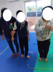 4本の紐の真ん中に横一列に並び、「前」と言ったら前に一歩!「後ろ」と言ったら後ろに一歩!