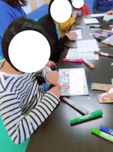 用紙に、名前と自分の誕生日を書き、シールやカラーペンでデコレーションしていきます。